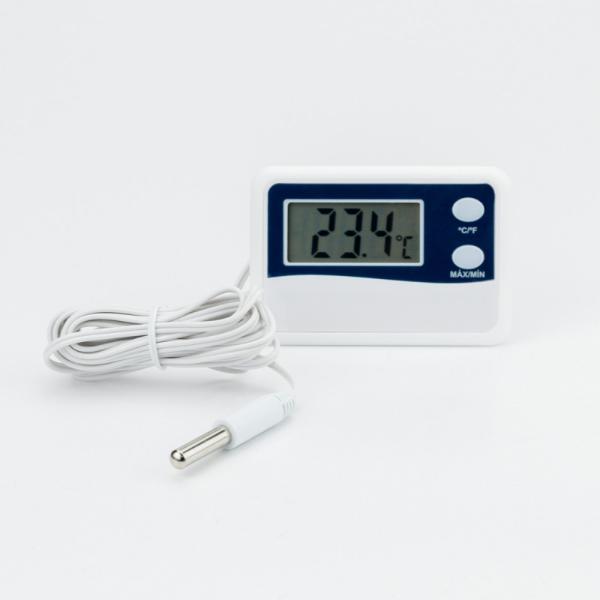 O termômetro digital de máxima e mínima é um instrumento de qualidade comprovada, com visor de fácil leitura, design arrojado destinado para medir a temperatura, e registrar as temperaturas máximas e mínimas. Indicado para várias aplicações tais como monitoramento de temperatura em freezers, caixa de vacinas, salas de armazenamento e ambientes climatizados em geral. O termômetro de máxima e mínima é à prova d'água e possui função ºC/ºF. Contém imã para fixação em superfícies metálicas e bordas de acabamento.