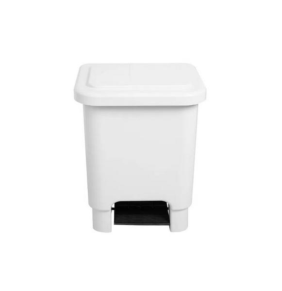 Lixeira retangular com haste metálica, pedal e suporte interno para sacos de lixo.