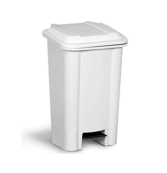 Lixeira retangular com haste metálica, pedal e suporte interno para sacos de lixo.