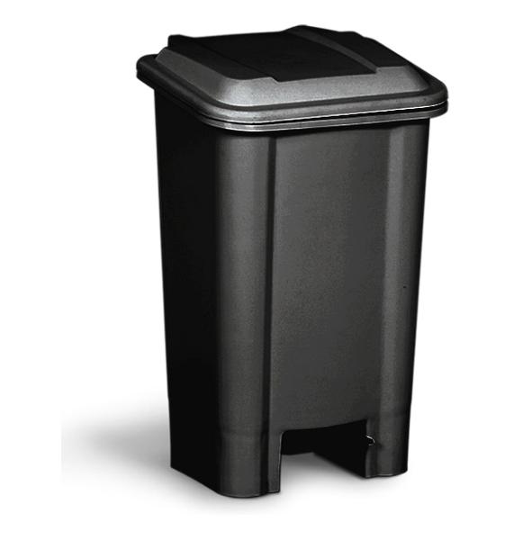 Lixeira retangular com haste metálica, pedal e suporte interno para sacos de lixo.