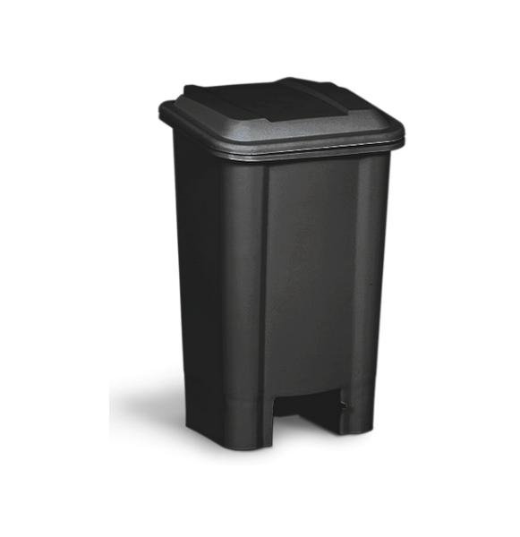 Lixeira retangular com haste metálica, pedal e suporte interno para sacos de lixo.